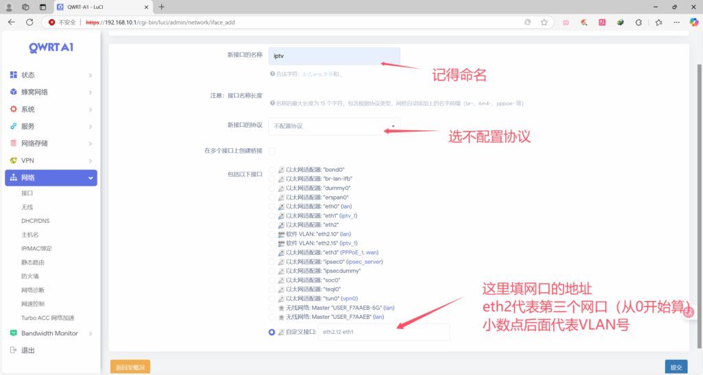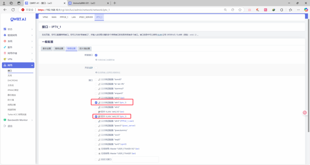注意:用于单线复用的网口,必须设置俩个VLAN,一个给IPTV使用,另一个供正常上网流量使用!