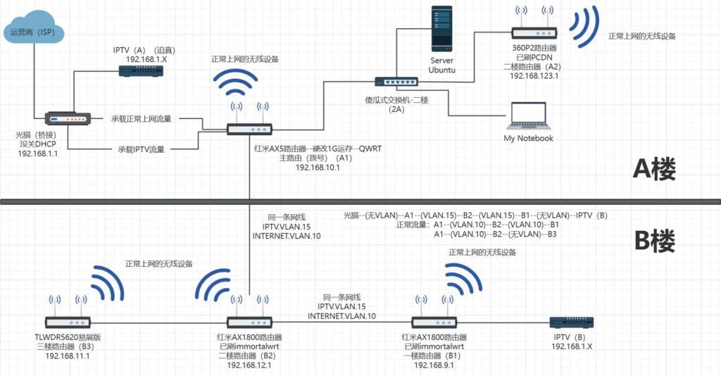 我家的家庭网络结构算是比较复杂的,宽带运营商为广东广电,需要兼顾到俩个IPTV(IPTV必须连接到光猫),在我改造之前光猫承载了绝大部分负载,入户带宽下行有500M,实际跑下来只有100M。